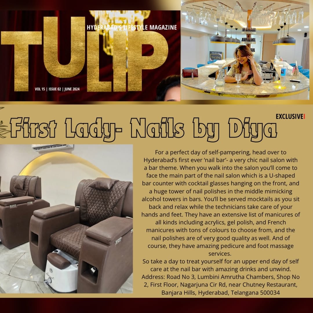 ✨ We are beyond thrilled and deeply honored to be featured in TULIP magazine’s July issue! 🌟 A huge thank you to the entire TULIP team for recognizing our unique concept and dedication to providing top-notch nail services. 💅💖 Our vision of blending a chic bar theme with the ultimate nail care experience has truly come to life, and we couldn’t be happier to share this with you all. To all our amazing clients, your continued support and love make it all possible. 🙏 Visit us for a perfect day of self-pampering, and enjoy our extensive list of nail services, manicures, pedicures, foot massages and eyelash extensions all in a fun and relaxing bar-like atmosphere. Cheers to beautiful nails and happy vibes! 🥂 📍 Address: Road No 3, Lumbini Amrutha Chambers, Shop No 2, First Floor, Nagarjuna Cir Rd, near Chutney Restaurant, Banjara Hills, Hyderabad, Telangana 500034 #FirstLadyNails #NailBar #Hyderabad #TulipMagazine #Grateful #ThankYou #NailCare #PamperYourself #NailArt #LuxuryNails