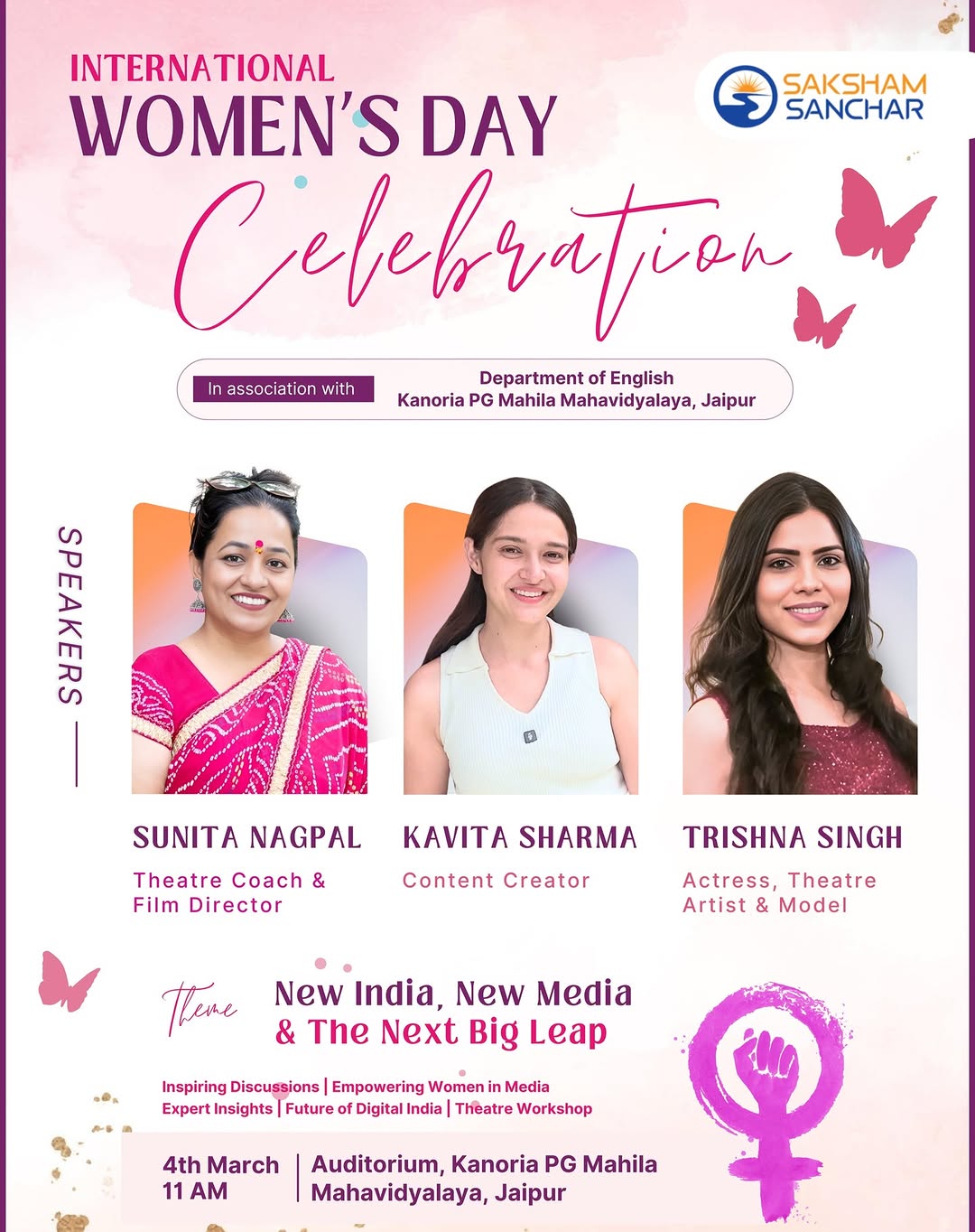 🌸✨ Celebrating the spirit, strength, and success of women! ✨🌸 Join us for an inspiring International Women’s Day Celebration with Saksham Sanchar Foundation in association with Kanoria PG Mahila Mahavidyalaya, Jaipur. 📅 4th March ⏰ 11 AM 📍 Auditorium, Kanoria PG Mahila Mahavidyalaya, Jaipur 🎭 Theme: New India, New Media & The Next Big Leap 🎤 Speakers: 🌟 Sunita Nagpal – Theatre Coach & Film Director 🌟 Kavita Sharma – Content Creator 🌟 Trishna Singh – Actress, Theatre Artist & Model 👩🎤 Engaging discussions, expert insights, empowering women in media & theatre workshops! 🚀 Let's take the next big leap together! 💜💪 #womensday #empowerwomen #sakshamsancharfoundation #newindianewmedia #womeninmedia #inspiration #womenpower #kanoriyacollegejaipur #jaipur