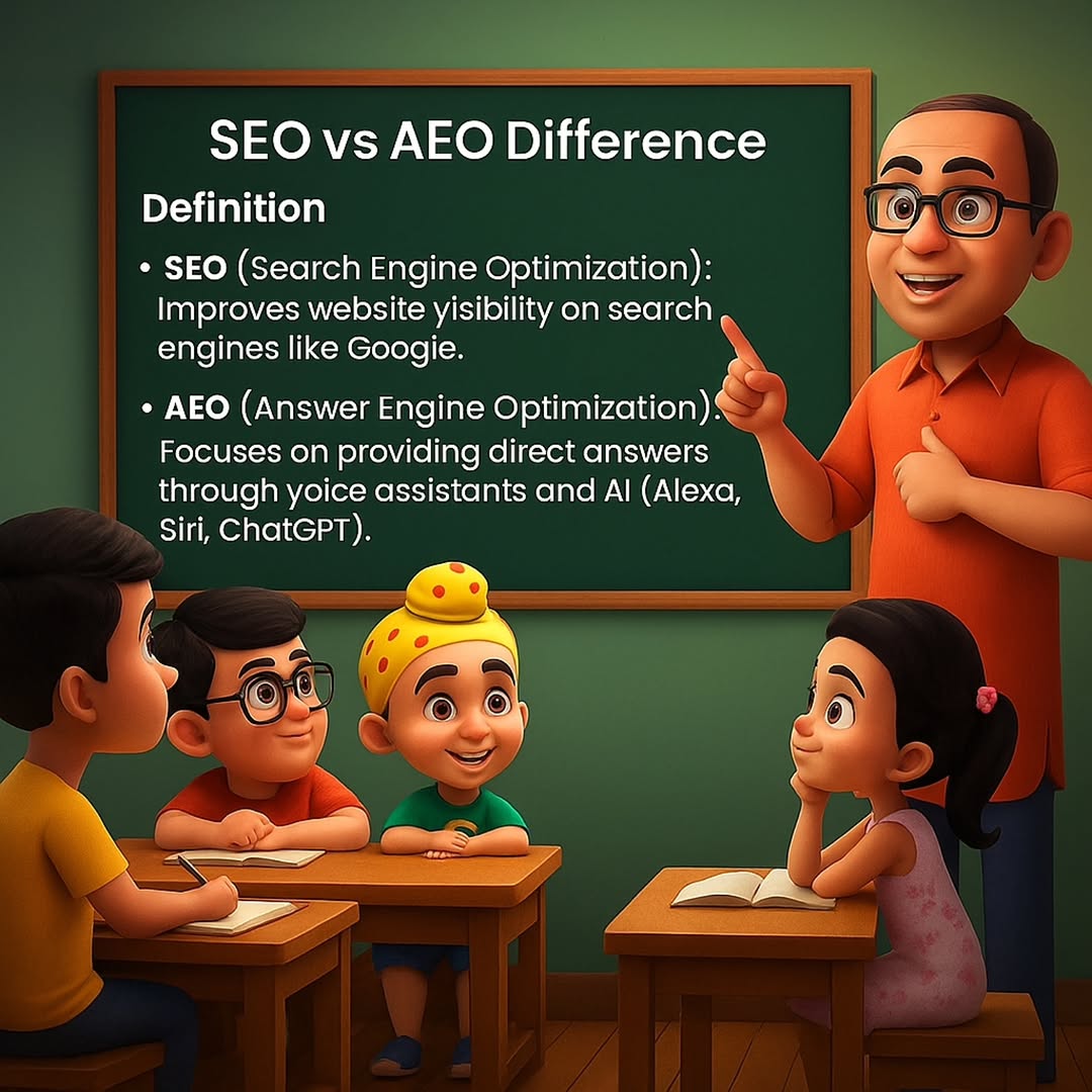 🚀✨ SEO vs AEO – The New Digital Classroom! What happens when Atmaram Bhide Sir 🧑🏫 teaches Tapu Sena about digital marketing? You get the most fun lesson on SEO vs AEO 🔍🤖 📚 Why this matters to YOU: ✅ SEO = Helps your website rank on Google using keywords, backlinks & blogs. ✅ AEO = Helps you appear in voice search & AI assistants (Alexa, Siri, ChatGPT). 💡 Did you know? By 2025, over 50% of searches will be voice-based 🎙️ That means if you’re not optimizing for AEO, you’re already behind! ⏳ 👉 We’ve broken it into 5 easy slides so you can learn step by step, just like Tapu Sena in Bhide Tuition Class. ➡️ Swipe → to discover: 1️⃣ What SEO & AEO really mean 2️⃣ Where each one focuses 3️⃣ How user intent is changing 4️⃣ What content optimization looks like 5️⃣ Why AEO is the future of search 🚀 ✨ Because digital marketing isn’t just about learning… it’s about Learning with Fun! 🔥 Save this post for future reference 💬 Comment below: Do you think AEO will replace SEO? 🔗 Share this with a friend who’s into digital marketing 🙂Follow 👉@digitalharsh143 for more interesting content . . . #SEO #AEO #DigitalMarketing #MarketingTips #VoiceSearch #LearnWithFun #ContentMarketing #MarketingStrategy #AI #ChatGPT #TMOCInspired #DigitalGrowth #MarketingMadeEasy #SocialMediaTips #seotips #seotipsoftheday #seomarketing #SEOoptimization #seotricks [SEO tips, SEO, AEO, Answer engine optimization, Content Marketing, ChatGPT, AI Prompts, Voice search, Google Rankings, Digital marketing tips]