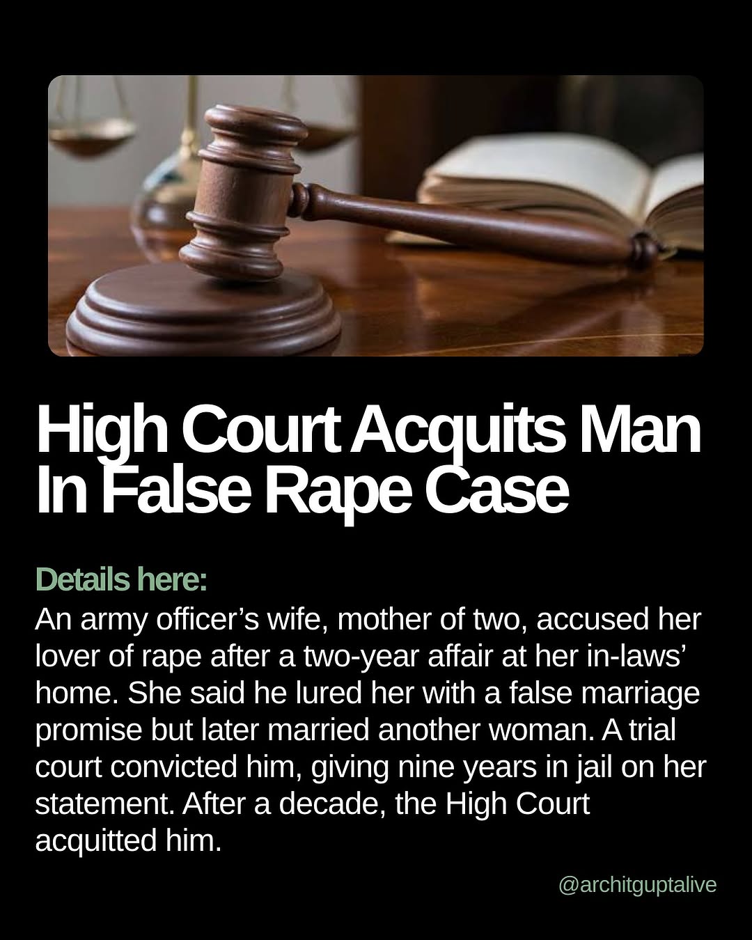 An army officer’s wife, mother of two, accused her lover of rape after he allegedly had a two-year sexual relationship with her at her in-laws’ home, during which they met around 60 times. She claimed he lured her with a false promise of marriage, but later married another woman. A trial court convicted him, sentencing him to nine years in jail based solely on her statement. After spending a decade fighting the case, the High Court has now acquitted him. #CrimeNews #adultery [false rape case, high court, false promise of marriage, army officer, rape allegation acquittal, false rape allegation, adultery]