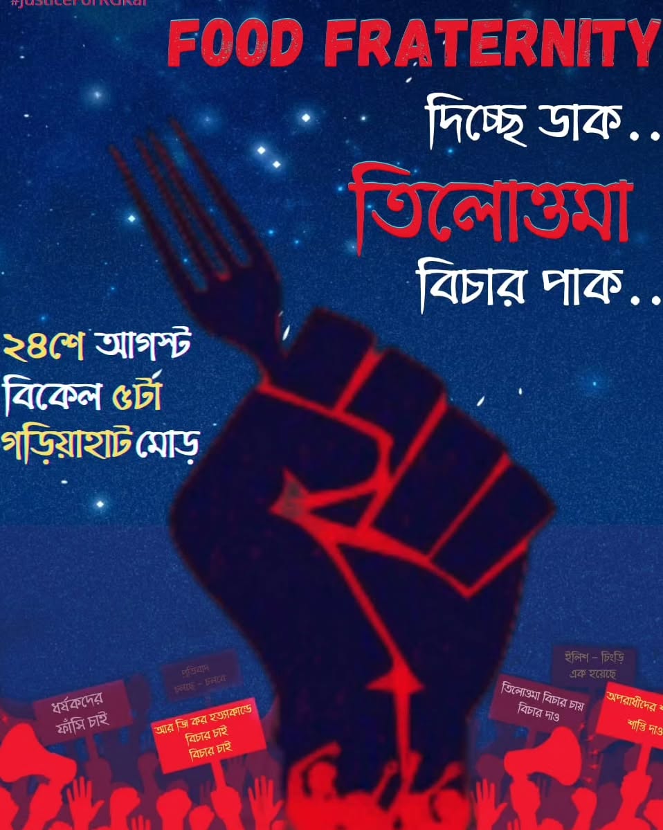 Food fraternity- খাদ্য জগৎ - কারা এরা? এরা হতেই পারে কোন সেফ, কোন রেস্তোরাঁ বা ক্যাফের মালিক/ কর্মচারী, কোন হোটেল কর্মচারী - যাঁদের দিনরাত কাজ করতে হয়। নিরাপত্তা -আলাদা প্রশ্ন, কোন গৃহসহায়ক/ সহায়িকা যার কাজের জন্য আপনার খাবার নির্দিষ্ট সময়ে এসে যায় (সে অবশ্য রাস্তায় কতটা নিরাপদ ভাবার বিষয়), রাস্তার রোলের দোকান, ফুচকার দোকান, মুদির দোকান - আবারো নিরাপত্তা জানিনা, ফুড রিভিউয়ার বা আমার মত তৃনসম শখের ফুড রাইটার, ফ্রিল্যান্স ফুড ফটোগ্রাফার বা হোমসেফ। Food fraternity বড় vague তাই। সোসিও- ইকোনোমিক মিল ছাড়া কিছু মানুষ যাঁরা আছেন। আরো অনেক উদাহরণ হতে পারে, হতেই পারে। লিখিনি, মাথায় এই মুহূর্তে আসেনি তাই। চব্বিশ তারিখ জানিনা যখন গরিয়াহাট পৌঁছাবো আশেপাশে কতজনকে দেখতে পাবো। এক, দুই, তিন, চার, অনেক? জানিনা। তবে জানি কেউ না কেউ আসবেন। বা সবাই আসবেন তিলোত্তমার জন্য তো বটেই, শহর তিলোত্তমার জন্যও। আর হ্যাঁ, আমাদের নির্দিষ্ট কোন জামাকাপড়ের রঙ নেই- সাদা, কালো, হলুদ, সবুজ - তিলোত্তমা জানতো না সেদিনের সেই জামার রঙ সাদা কালো দিয়ে আলাদা বোঝাতে হবে। আমাদের ব্যানার থাকতেও পারে, নাও পারে। মোমবাতি থাকতেও পারে, নাও পারে। আমরা থাকবো। মানুষ। থাকবো মানুষের জন্য। আসবেন? মানুষ হিসাবে মানুষের জন্য? #justiceforrgkar #kolkata