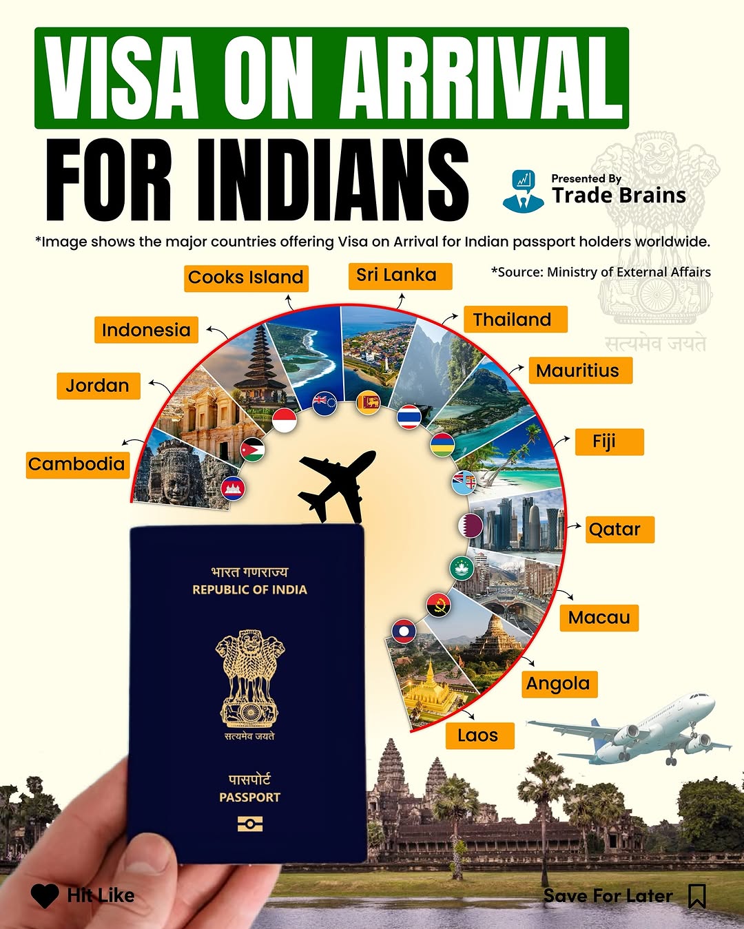 🌍✈️ Visa on Arrival for Indian Passport Holders – A Travel Game Changer! Dreaming of a last-minute international getaway without the stress of embassy appointments and lengthy paperwork? Great news — it’s possible! Many countries now offer Visa on Arrival (VoA) or e-Visa options for Indian citizens, making global travel more convenient than ever. From the tropical beaches of Thailand 🇹🇭, to the rich history of Cambodia 🇰🇭, and the breathtaking landscapes of Jordan 🇯🇴 — your Indian passport opens more doors than you might think. 🧳 Which country offering Visa on Arrival is on your bucket list? Let us know in the comments! 👇 Follow @trade.brains Follow @trade.brains #thailand #indianpassport #indianpassportpower #visaonarrival #evisa #jordan #laos #cambodia #srilanka #mauritus #visa #visaservices #indianvisaservices #travel #lifestyle