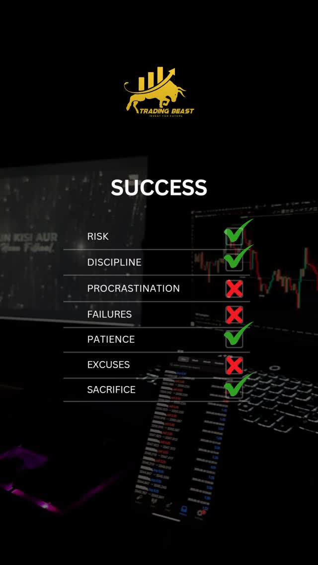 Success needs ✅ Risk, Discipline, Patience & Sacrifice. ❌ No Procrastination. No Excuses. . . #TradingBeast #SuccessFormula #GoldenChickenIndicator #TradingDiscipline #StockMarketIndia #ForexTrading #CryptoTrading #SmartTrading #MindsetIsEverything #NoExcuses #TraderLife #PriceActionTrading #RiskManagement #PatiencePays #TradingJourney