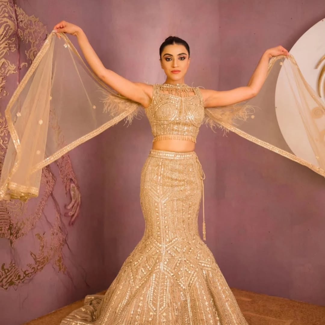 Crafted in a champagne gold, this heavily embellished lehenga is all about intricate handwork, rich texture, and regal elegance. The blouse features detailed mirror and sequin embroidery, perfectly paired with a flowy lehenga skirt that catches the light with every movement. The soft net dupatta with delicate buti work and a subtle border adds just the right touch of grace. ✨ . . Outfit: @queenscoutureofficial inframe: @jasmeet.kaur01_official MUA: @makeupby_kanishakapoor Hairartist: @simran_hairartist77 . . Shop from the website: www.queenscouture.in . . Queens Couture - The Ethnic Regalia Lawrence Road, Amritsar For bookings call: +91 8264450029 . . . . #AmritsarDresses #BestAmritsarSuits #QueensCouture #Gowns #ElegantAttire #BestAmrtisarClothingShops #BestAmrtisarCocktailGowns #BestAmritsarAnarkali #BridalInspiration #BigFatIndianWedding #BridalLehenga #BrideToBe #ShaadiSaga #WeddingSeason #IndianBride