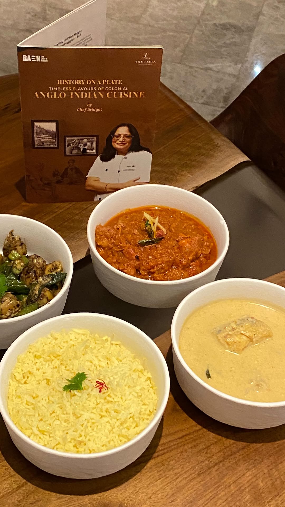 Meeting Bridget White Kumar, renowned culinary historian recently @raen.hyderabad, the unique chef-themed studio at The Leela Hyderabad provided valuable insights into the making of the rare cuisine of the Anglo Indian community. Ms Bridget, who spent her formative years in Kolar Gold Fields in Karnataka remembers growing up savouring the best culinary traditions of European cuisine, (she herself has Dutch & Portuguese family lineage) and how it influenced her culinary outlook. The pop up curated by the home chef features heritage dishes from Dak bungalows, railways, army camps, tea gardens and clubs. Coming to my experience of “History On A Plate” : Colonial Mulligatawny soup was brilliant in its part soupy part well bodied texture and had a subtle aftertaste of cumin and black pepper, paired with garlic bread (chef had a tish tosh name for it which I can’t recollect!). For starters, the Crispy Cheesy Potato and Spinach Rissole was the surprise package with its spinach filling being seasoned ever so lightly and the crispness of the crumb fried rissole being perfect. The Chicken cutlets with Devil Chutney and Anglo Indian battered prawns were pretty good too. The Classic Anglo Indian Mutton Vindaloo was distinct from the Goan version in that it was subtler, in spice and tartness and the sauce was just right, not too thin or thick and the meat was perfectly cooked, tender and yet not lacking bite. Along with the Anglo Indian saffron coconut rice, it truly was the heart and soul of the food promotion, personally speaking. The Anglo Indian fish moley was equally good and so was the vegetarian dish which chef Bridget chose for us , pepper okra & potato stir fry. Old fashioned Bread Pudding (warm and inviting), Classic Caramel custard were superlatively done classic desserts while the Memsahibs Mess with a Twist , whipped dairy cream , meringue cream, mango chunks and black pepper mango purée was a delightfully contemporary creation. Was inspiring to learn that Bridget has published nine books on Anglo Indian culinary history, and was spurred by her Singapore-based daughter to document her recipes.