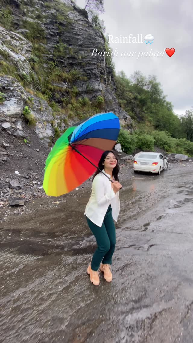 Monsoon.. aur ye barish.. aur ye pahad🌧️❤️ Enjoying the monsoon in middle of the hills of Manali Hahha epic moment- to ask this colourful umbrella just to shoot😂😂 #monsoon #barish #tiptip #barishkijaye #monsoonseason☔️ #manalı #nanital