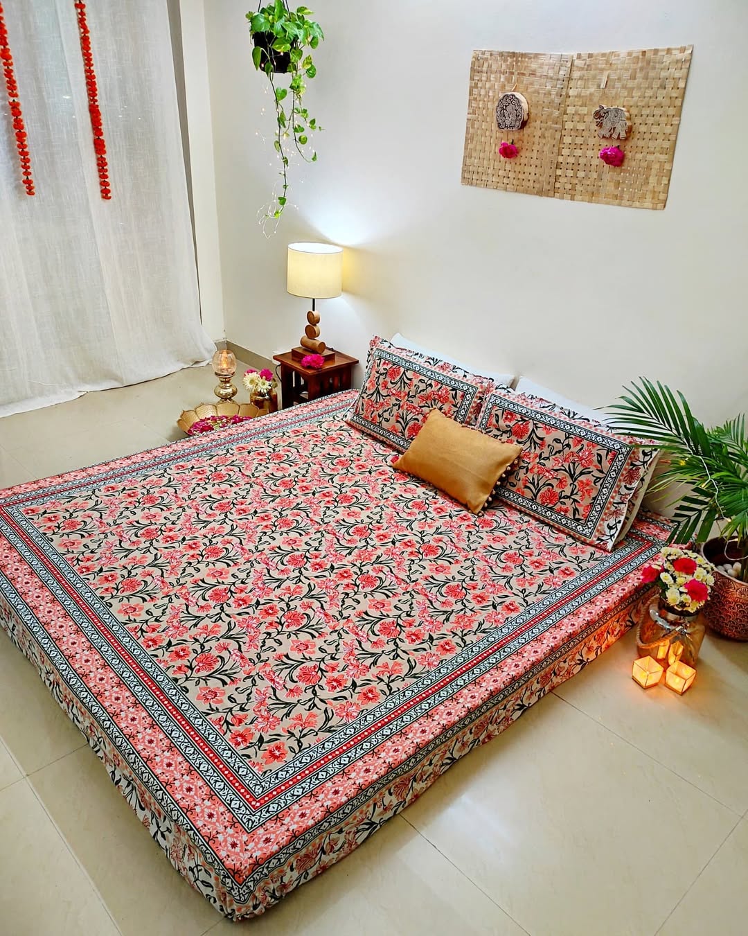 Festive Bling in bedroom space✨ In love with this beautiful floral Bedsheet set from @kalpvrksha (Swipe To See All Pictures) Floral motifs and this colour is perfect for festival season, pure cotton fabric made with love from artisans of Rajasthan, this Bedsheet set is stunningly beautiful. @kalpvrksha has more such beautiful options in bed linen. Do visit them for sure. This Diwali support local artisans, support handmade and bring Happiness in every home✨ . . . . . . . . . . . . . . . . #mybedroom #bedroomdecor #diwalidecor #diwalidecoration #diwali2021 #floorbed #goodhomesindia #diydecoration #diyhomedecor #indiandecorideas #mydesiswag #uchomes #beautifulhomesindia #indianhome #indianhomedecor #desidecor #colorfuldecor #crashbangcolour #bohohomedecor #bohodecor