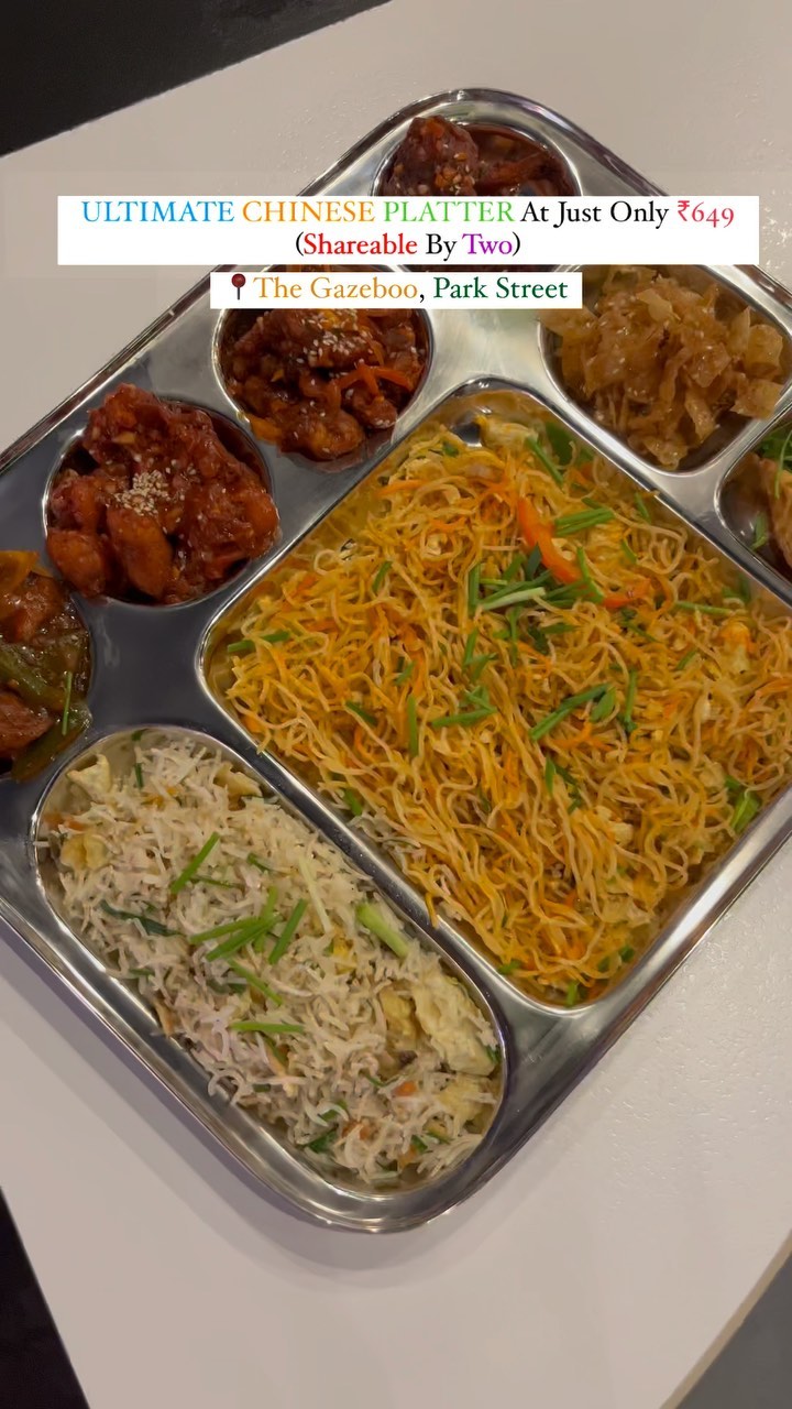 #chineseplatter • @thegazebookolkata They have newly introduced their •ULTIMATE CHINESE PLATTER at only ₹649 which includes Egg Burnt Garlic Noodles, Egg Fried Mongolian Rice, 2 pc Momo, 2 pc Lollipop, Crispy Conjee Chicken (Dry), Schezwan Chicken Gravy, Crispy Chilli Babycorn, Darsaan (Dessert) Beside this we tried their another newly launched thali which is •AL-KHALIFA THALI at only just ₹879 with the items included: AL- Khalifa Thali Mutton Biryani + Aloo, Mutton boti Kebab (2 pc), Kadhai Mutton (2 pc), Chicken Reshmi (2 pc), Chicken Hariyali (2 pc), Chicken Peshwari tikka kebab (2 pc), Chicken Sunehri Tangdi (1 pc), Roti (1) Both the thalis are shareable by two. Also do try their mocktails,desserts and other delicious items from Ala Carte menu. 📍The Gazeebo, 1, Park Ln, Esplanade, Mullick Bazar, Taltala, Kolkata, West Bengal 700016 💸1000 for two approx Do follow @_bonglicious_ for more mouthwatering updates #reelsinstagram #trendingsongs #viralvideos #explore #explorepage #foodreels #platter #biryani #muttonbiryani #chinesefood #chicken #momo #kolkata #kolkatafoodie #exploremore #newreel