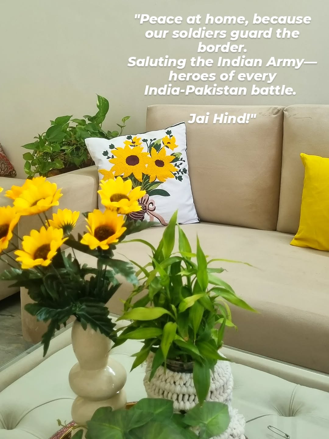 "A peaceful home is a blessing we enjoy every day—thanks to the bravery and sacrifice of our Indian Army. Saluting our heroes who guard our serenity with strength and honor. Jai Hind!"