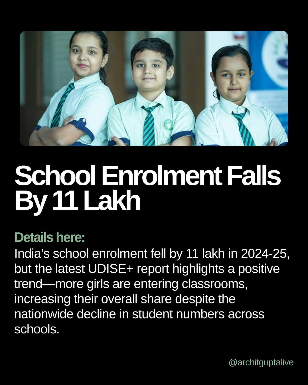 This post was published on 29th August, 2025 by Archit on his Instagram handle "@architguptalive (Archit Gupta)". Archit has total 153.4K followers on Instagram and has a total of 386 post. Archit receives an average engagement rate of 0% per post on Instagram. This post has received 0 comments which are than the average comments that Archit gets. Overall the engagement rate for this post was than the average for the profile. #Schools #Schoolsenrolment #educationnews has been used frequently in this Post.