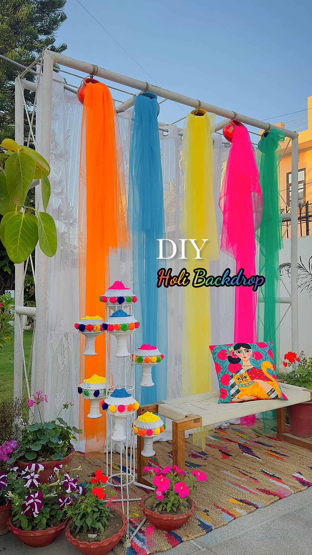 DIY Holi Backdrop 📸💦 . Create a vibrant and colorful Holi backdrop to capture the most unforgettable memories this season! 🌈✨ This setup is bursting with life, and my photos from last Holi turned out absolutely stunning against it. If you love it, don’t forget to leave a comment! . (DIY Holi backdrop, Holi setup, colourful backdrop, wedding backdrop, Indian Holi decor, Holi hai, diy, diy Holi, Holi vibes, diy garden decor) . #holiparty #holihai #diybackdrop #weddingdecor #holivibes #colorfulmemories #diycrafts #diyhomedecor #diygarden #balconydecor #trendingsongs #viralvideos