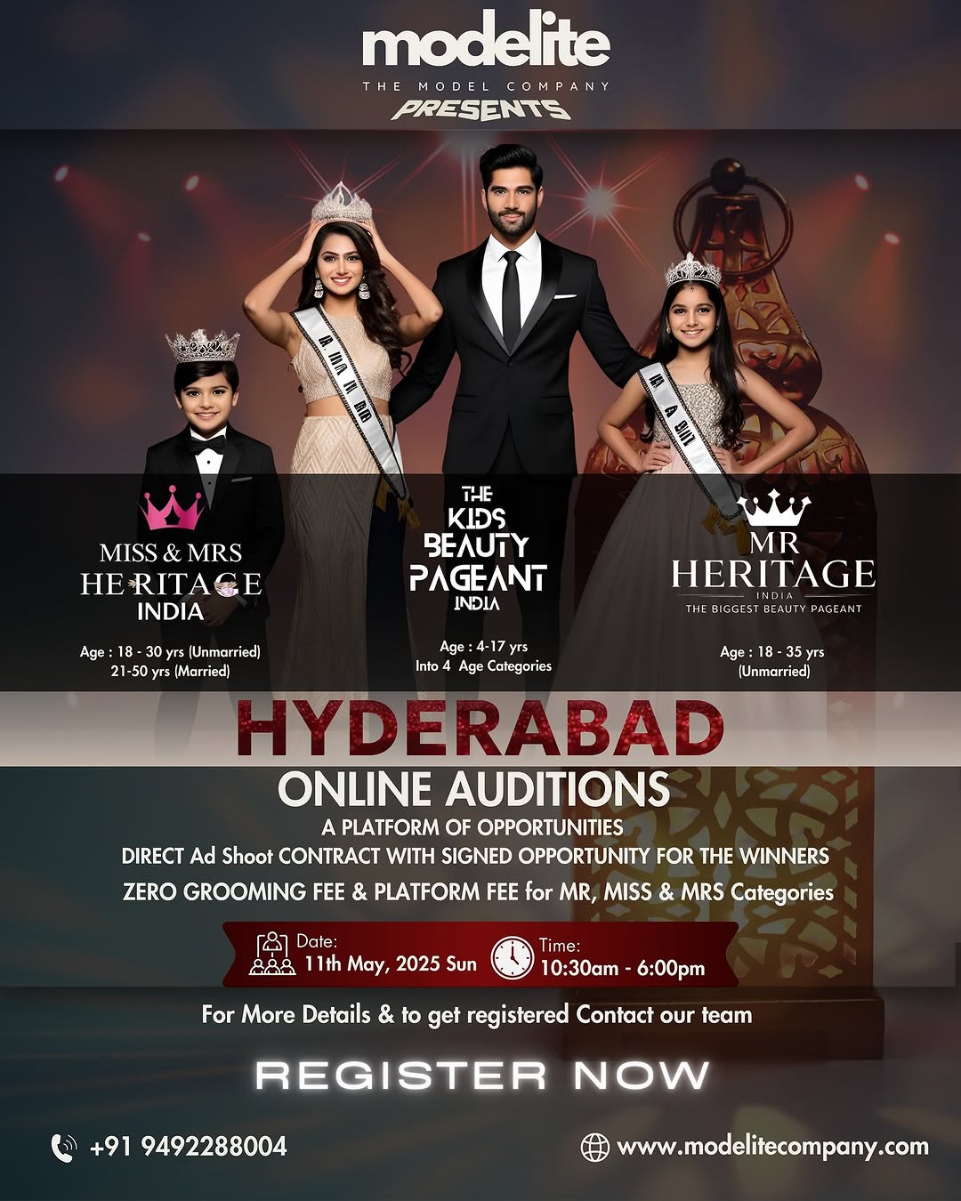 HYDERABAD AUDITIONS ALERT!🔔 Modellite Company presents Miss & Mrs. Heritage India, Mr. Heritage India, and The Kids Beauty Pageant India - a platform to shine, inspire, and redefine elegance! Auditions for HYDERABAD Miss Heritage India (18-30 yrs) Mrs. Heritage India (21-50 yrs) Mr. Heritage India (18-35 yrs) Kids Beauty Pageant India (4-17 yrs) - Toddler, Prince/Princess, Pre-Teen, and Teen categories! WINNERS WILL GET DIRECT OPPORTUNITIES by MODELITE AGENCY Don’t miss this chance to make your mark! TIME : 10:30 am -6 pm To Register or For more details : Contact: 9492288004 🌐Visit: www.modelitecompany.com #MissHeritagelndia #MrsHeritagelndia #MrHeritagelndia #KidsBeautyPageantIndia #Modellite #hyderabad #hyderabadnews #hyderabadcity #hyderabadauditions #modelsearch #modelitecompany #irohitsuvvada #rohitsuvvada #kidspageant #kidsfashionshow #beautypageant