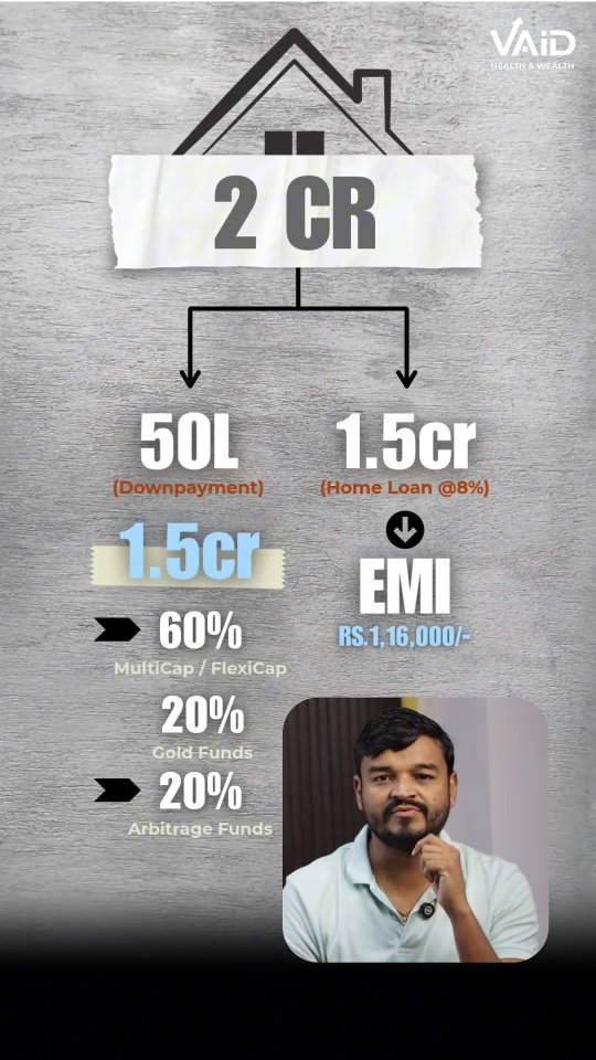 Top 3 Funds to Pay Off Your Home Loan EMIs 💰🏠 Never buy a house *entirely* with cash! Here's a smarter way: Let’s say you have ₹2 Crore and you want to buy a house worth ₹2 Cr. Instead of paying full cash, take a **home loan at 8% interest**. Put ₹50L as down payment and take ₹1.5 Cr loan. Your EMI for 25 years = approx ₹1.16L/month. Now invest your ₹1.5 Cr in **3 mutual funds** and start a **monthly SWP of ₹1.24L** (to cover EMI + tax). If your portfolio earns just **12% annually**, by the end of 25 years, your home loan will be paid off *and* you'll still have **₹6.38 Crores**! 💡 Fund Allocation: 🔹 60% in Diversified Equity Fund (Flexi-cap or Multi-cap) 🔹 20% in Gold Fund 🔹 20% in Arbitrage Fund 📊 When markets fall → increase equity allocation 📈 When markets rise → shift more to arbitrage Save this post 📌 Follow for more smart financial hacks 💼 Drop a comment if you want your personalised plan 👇 \#HomeLoanHacks #MutualFundStrategy #SWPStrategy #HomeBuyingTips #SmartInvesting #WealthCreation #FinancialFreedom #LoanPlanning #MoneyTips #InvestSmart