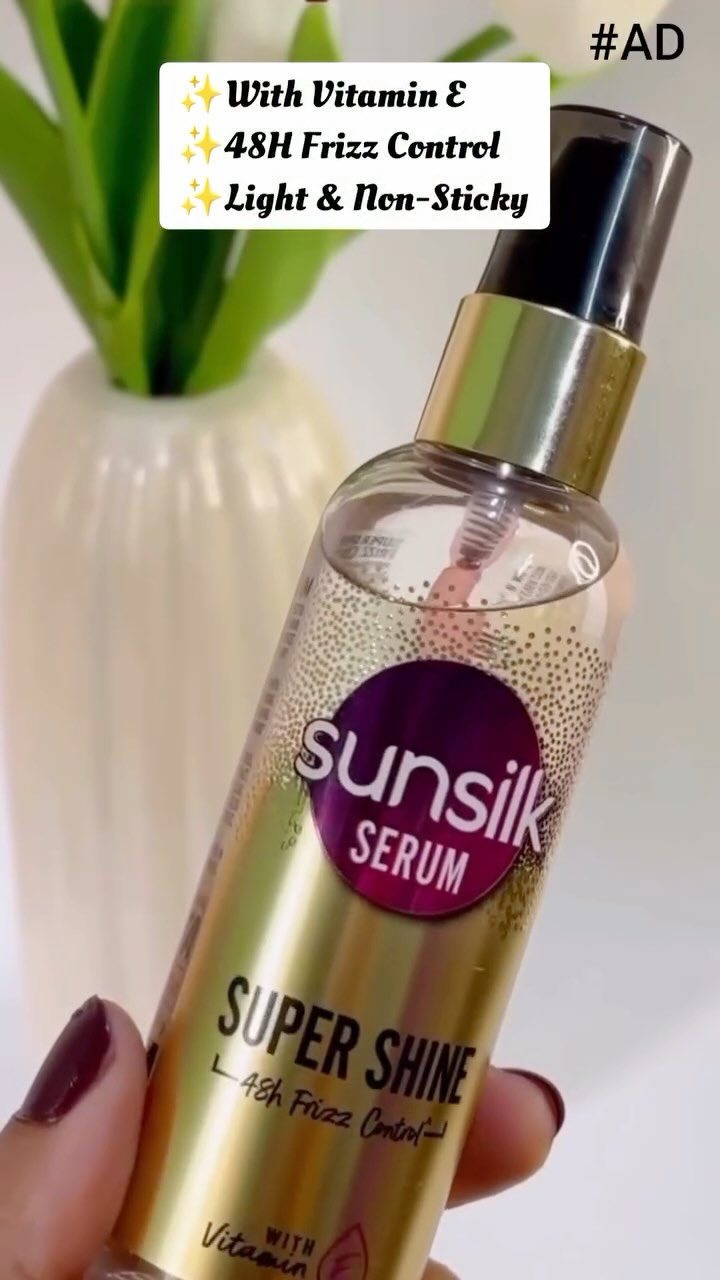 Caption What’s in my summer bag? Sunscreen, lip balm, and this little serum that’s saving my hair one frizz wave at a time. 💁♀️ The Sunsilk Super Shine Serum is light, non-sticky, smells so good—and gives me 48H frizz control! #FrizzOffShineOn #ad #sponsored