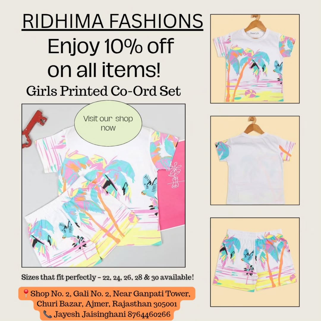 🌸 Let your little diva shine in style! Our vibrant Girls Printed Co-Ord Sets are perfect for playdates, outings, and every twirl in between 💃✨ 👗 Sizes available: 22, 24, 26, 28 & 30 📍 Visit us and enjoy 10% OFF on all items! 🛍 Shop No. 2, Gali No. 2, Near Ganpati Tower, Churi Bazar, Ajmer 📞 Jayesh Jaisinghani – 8764460266 #ridhimafashions #ajmershopping #girlsfashions #coordsets #printedoutfit #kidswearindia #stylishkids #ajmerbazaar #kidsstylediaries #ajmer #ajmersharifdargah #ajmersharif #ajmercity #kidsclothing #kidswear #coordsetstyle #prints #kidsootd #summerwears #trendykids #mommychoice #shoplocalajmer