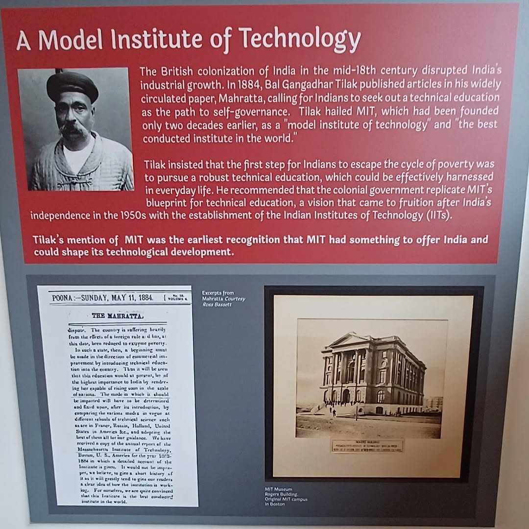 We recently visited the science gallery in Bangalore. An exhibition on the India - MIT connection was on at the center, which was the result of alumni association who had painstakingly found old archives and letters to put a beautiful an enriching story together. I found this gem in that exhibition, which showcased Lokmanya Tilak's reference about MIT in 1884!! He extolled Indians to pursue technical education and hailed MIT as a model school for technical education. Using his newspaper as the medium he encouraged young Indians to enrol in MIT and come back with their technical knowledge to empower India and free her from colonial rule! Today on the death anniversary of this visionary leader, I can only imagine the power of his love for the country, that made him search far and wide for opportunities Indians under colonial rule. Remember it was a time way before Google. India was under colonial rule so free information exchange was a myth. His articles were always seen as a threat to the colonial rule and the circulation was never easy, let he managed to encourage a bunch of people to travel to MIT and pursue a technical education. @indians_in_mit @mit