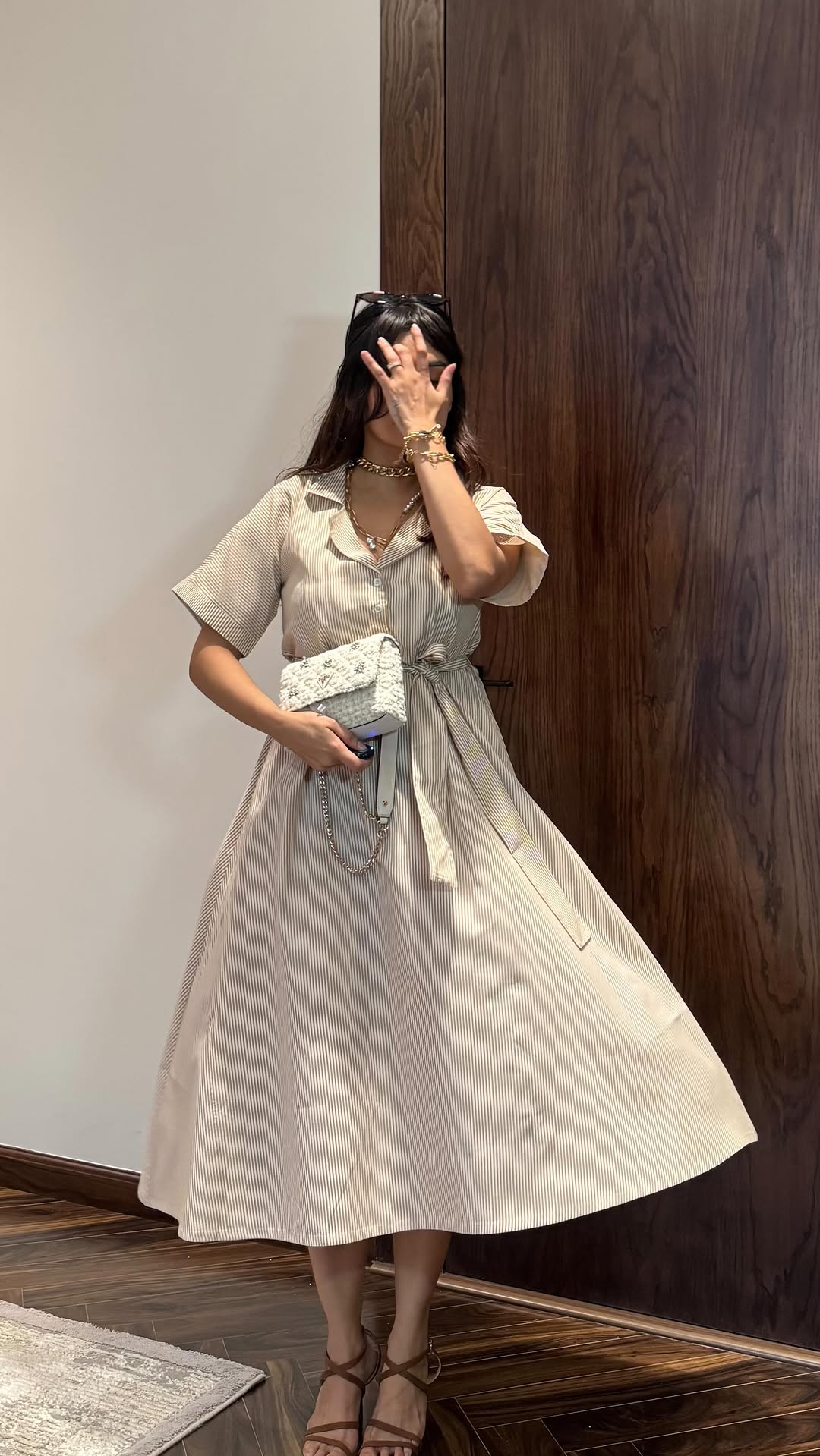 Easy stripes, breezy cotton, effortless style 🌿 Meet the Sandstone Stripe Shirt Dress 🤎 Dress - @shopkhamna Jewellery- @zohirajewels Heels - @charleskeithofficial Bag - @guess Shades - @hm Bow - Thailand street shopping #stripedress #shirtdress #elevated #everydaylook #stripes #classic #mididress #dresses #cotton #premium #jewellery #pearl
