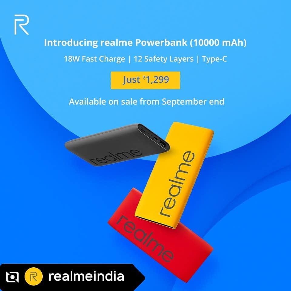 #Repost ... Introducing the new 10,000mAh #realmePowerbank priced at ₹1,299. It comes with 18W In and Out two way fast charging technology and USB Type-C and Type-A port for quick charging. Available on sale from end of September.