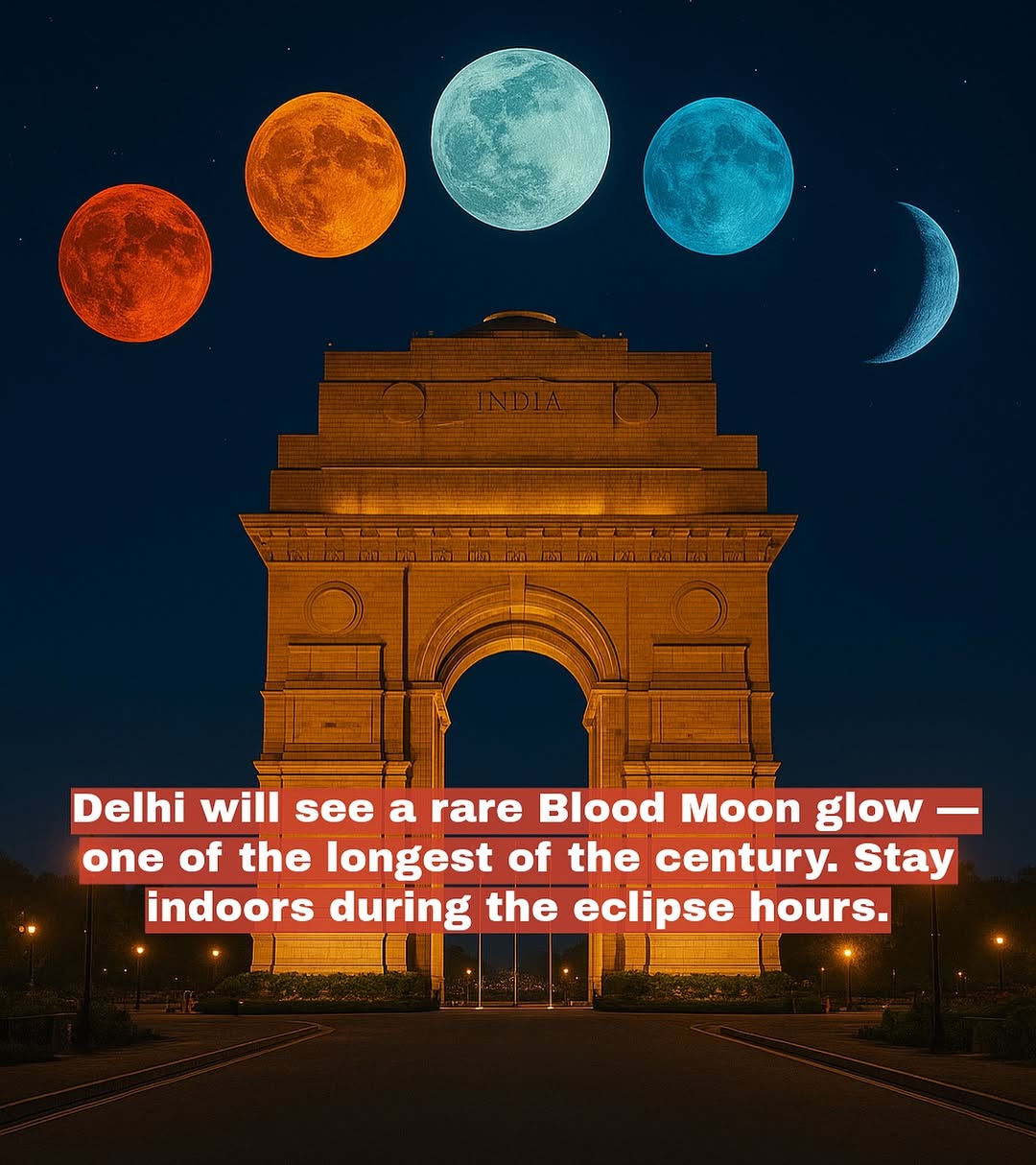 Correction: Its your choice to go outside or not. Delhi to witness a rare Blood Moon on Sept 7 night! ✨🌕 On 7–8 Sept 2025, Delhi skies will host one of the longest lunar eclipses of the century — the Moon will glow red for 82 minutes. 🔴 📍 Timings (IST): • Starts: 8:58 PM • Partial: 9:57 PM • Total Blood Moon: 11:42 PM – 1:04 AM • Ends: 2:25 AM 🌌 Caused by Earth’s shadow filtering sunlight, the eclipse paints the Moon crimson. 🙏 Traditions say: ✔️ Meditate, chant, bathe before/after ❌ Avoid food, touching idols & going outside during Sutak ⚠️ While science says it’s safe to watch, Indian customs advise staying indoors during the eclipse. #MoonGarhan #BloodMoon #ChandraGrahan2025 #delhincr #delhi