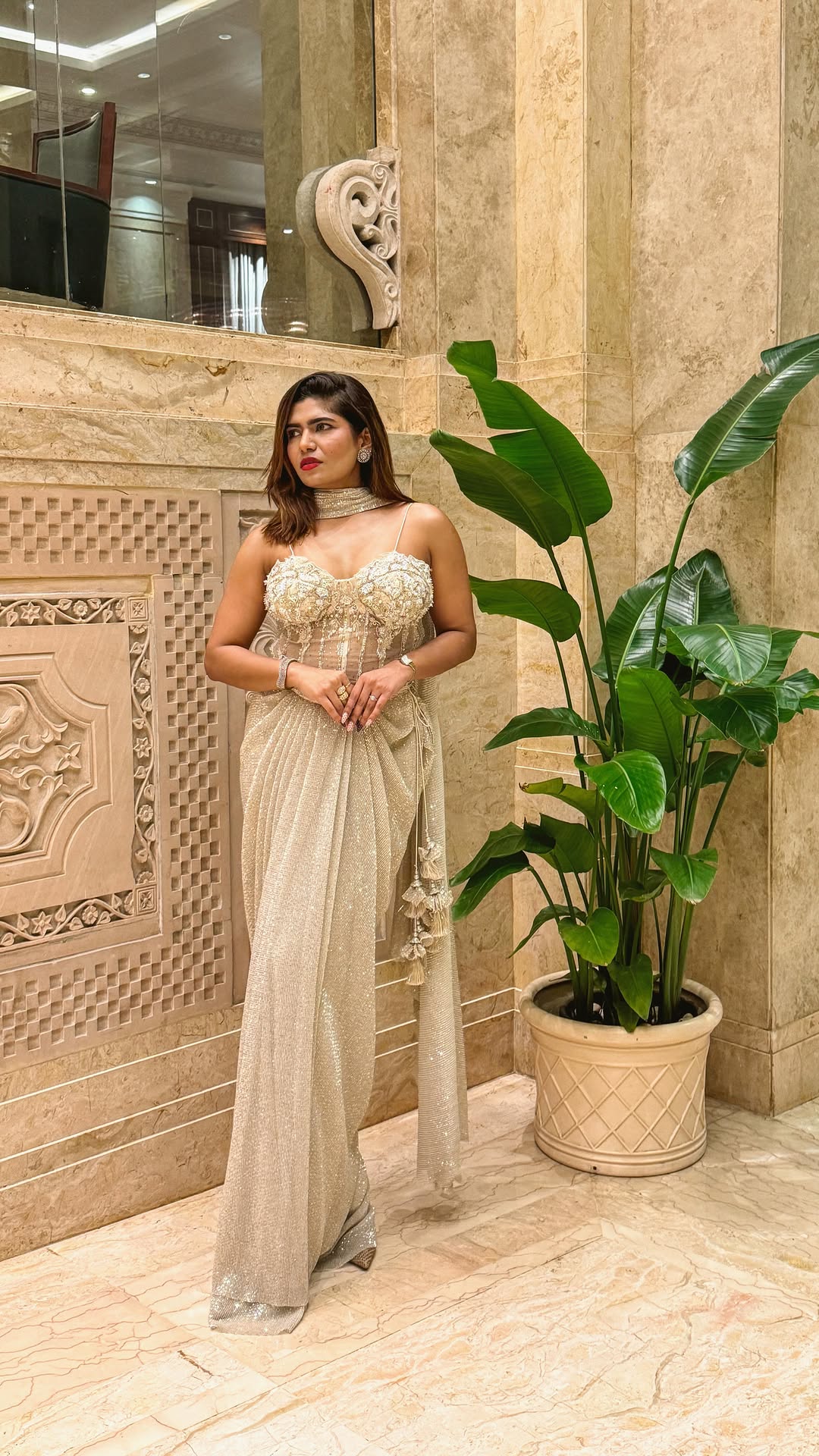 Making an entrance with the most gorgeous Corset Sari from @queenstownfashion ✨ #theleggylass #diwali #diwaliparty #fashion #corsetsari #prestitchedsaree #sequinsaree #sequinsarees