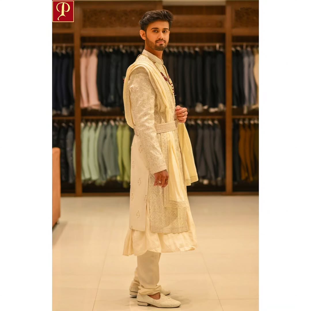 Honoring Tradition with White Elegance By :- @porwaldresses . In frame :- @its.drm 📸 :- @arushfilmsphotography__ Mua :- @glamour__gloss_ . . . #whiteethnic #indiangroom #porwaldresses #indorecity #indianwedding #partywearsuits #whitedress #shervani #porwaldressesindore