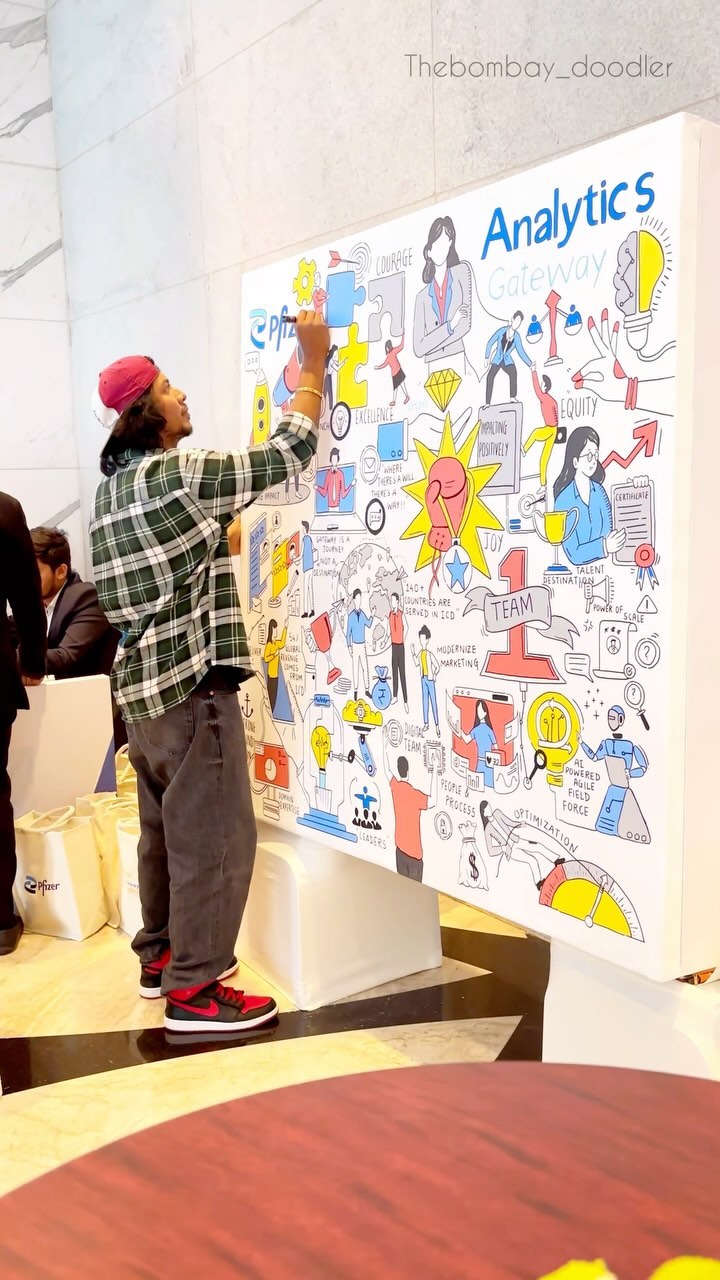 So excited to have live doodled for @pfizercareers at their amazing event! Hearing all about their Analytics Gateway vision, expertise, innovation, and their ‘One Team Mission’ was so inspiring. They also talked about modernizing marketing with AI and continuous optimization—so much to take in! Working on a 5x5 feet canvas while soaking up all that knowledge from some incredible speakers was an awesome experience. Huge thanks to Pfizer for having me, it was a blast! ✨🌻 . . . . #livedoodles #doodleoncanvas #scribbleart #sketchnotes #sketchnote #sketchnoting #artrreels #doodleartist #corporateevent #liveeventpainting #liveeventpainter #liveeventartist