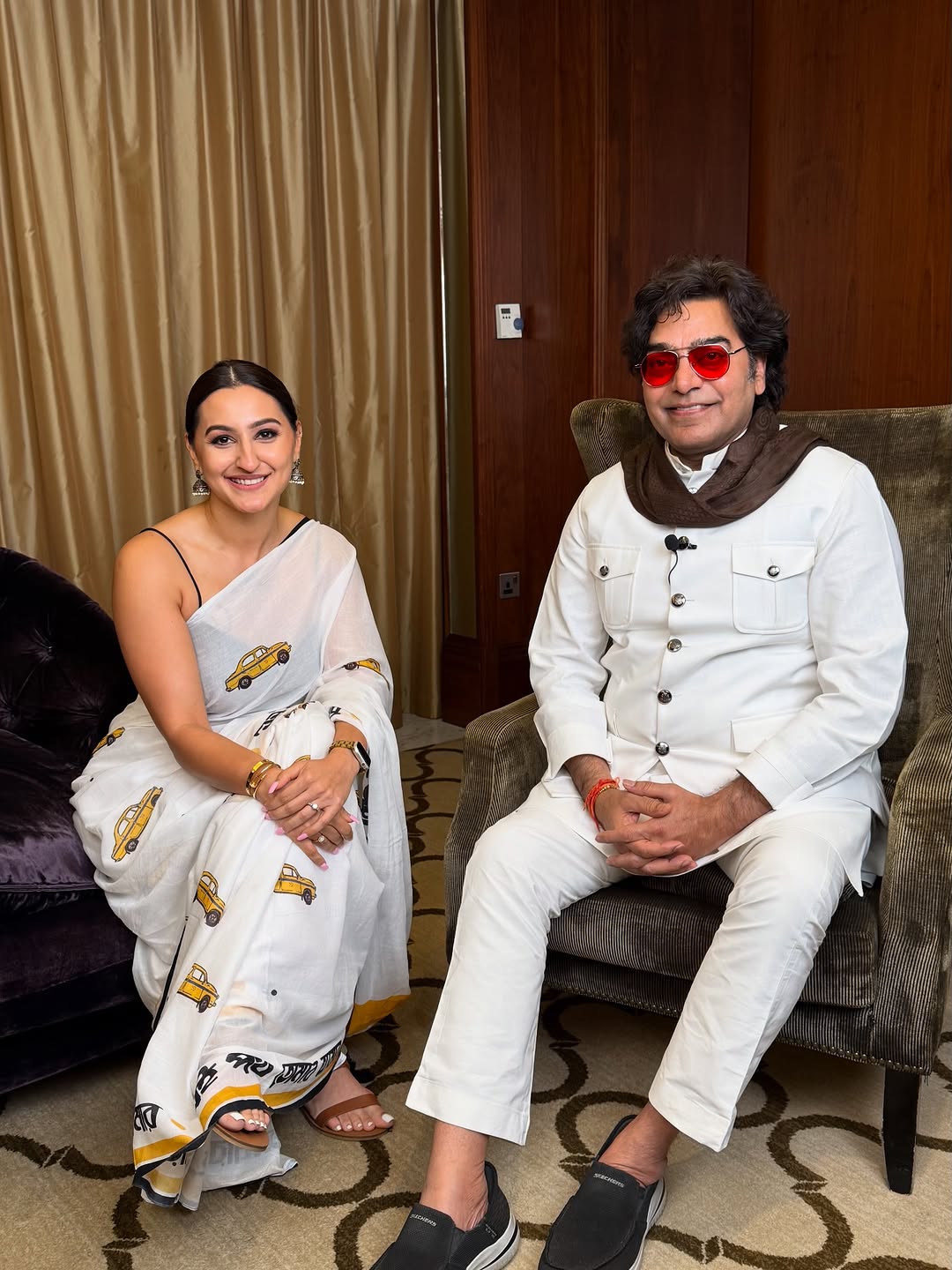 A few weeks ago I was asked to enact the movie “Sangharsh” in a dumb charades round and I realized (not in that moment but later) that the best way to do it was the iconic scene by @ashutosh_ramnarayan wearing a saree and moving a finger in his mouth whilst yelling. Damn that scene still haunts my childhood memories. Today I sat across from and interviewed the legendary actor behind one of the most iconic villainous roles in Bollywood. Excited to see him bringing the complex character of Raavan to life in #HumaareRam, all set to take over Dubai Opera soon. Absolutely enjoyed learning your perspective on life and art, truly a man of depth and substance 🙏🏻 . . PS he also loved my Saree :) It’s from @suta_bombay #ashutoshrana #humaareram #dubai #sangharsh #bollywood #raavan