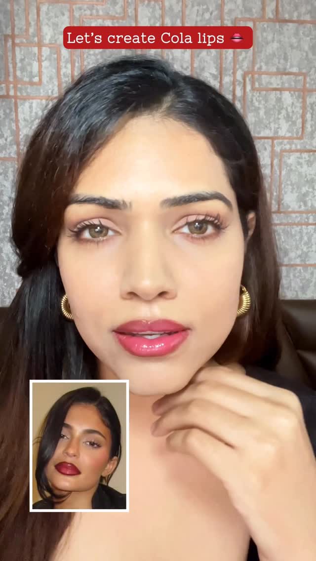 Comment for link! Cola lips 💋 it’s super easy! First, outline your lips with a brown lip liner. Next, fill them in with a maroon lipstick. Then, dab a tissue to remove the excess. Now, layer a very light pink lipstick on top. Add a clear gloss for that juicy shine. Finally, re-outline your lips with the same brown liner… and you’re done! Cola lips in just a few steps. #colalips #lipstick #lipstickswatchesindia #indianskintone #mumbaibeautyblogger #indianbeautyblogger #makeupblogger #makeupcreator #makeuptutorial