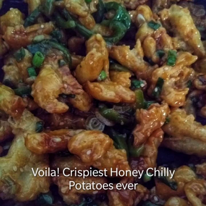 𝗖𝗿𝗶𝘀𝗽𝗶𝗲𝘀𝘁 𝗛𝗼𝗻𝗲𝘆 𝗖𝗵𝗶𝗹𝗹𝘆 𝗣𝗼𝘁𝗮𝘁𝗼 We are quarintined but our tastes buds are not. Presenting my maidan video of Home Cooking series. Today we will try our hands on Indo-Chinese Appetizer. I am showing you secret recipe of making Crispiest Honey Chilly Potatoes ever. Inspired by @bharatzkitchen . Link for his video in Bio. Do tag me and @bharatzkitchen in your Honey Chilly Potatoes post. 𝗜𝗻𝗴𝗿𝗲𝗱𝗶𝗲𝗻𝘁𝘀: 𝗙𝗼𝗿 𝘁𝗵𝗲 𝗳𝗶𝗿𝘀𝘁 𝗰𝗼𝗮𝘁𝗶𝗻𝗴 (𝗱𝗿𝘆 𝗯𝗮𝘁𝘁𝗲𝗿) ½ cup all-purpose flour (Maida) ¼ cup cornflour 1/8 tsp. salt 2 tbsps. Oil 𝗙𝗼𝗿 𝘁𝗵𝗲 𝘀𝗲𝗰𝗼𝗻𝗱 𝗰𝗼𝗮𝘁𝗶𝗻𝗴 (𝗹𝗶𝗾𝘂𝗶𝗱 𝗯𝗮𝘁𝘁𝗲𝗿) ½ cup all-purpose flour (Maida) ¼ cup cornflour 1/8 tsp. salt 2 tbsps. Oil ½ cup water (fill the cup till the top) 𝗙𝗼𝗿 𝘁𝗵𝗲 𝘀𝗮𝘂𝗰𝗲: 2 mid- size potatoes 4 Green onions / ½ red onion (sliced) ½ bell pepper (capsicum sliced) 1 tsp. of ginger (chopped) 6-8 cloves of garlic (chopped) 3 tbsps. Honey/1-1.5 tbsp. sugar 1 tsp. sambal (chilly sauce basically) 2 tbsps. Soya sauce 1 tsp. tomato ketchup ¼ tsp. black pepper/ ¼ tsp. white pepper 1/8 tsp. Monosodium glutamate (also known as Ajinomoto) ½ tsp. sesame seeds (optional) 𝗞𝗘𝗬 𝗣𝗢𝗜𝗡𝗧𝗦: Add oil in the batter for coating. Coat the potatoes twice; first with dry batter and then with liquid batter. Fry the potatoes twice; first on a high flame for 2-4 minutes, And then on low flame until golden brown. Add honey/sugar in the sauce after turning the flame off. Add potatoes in the sauce after 5 minutes of turning the flame off. #foodliners #homecooking #homechef #indochinese #quarantinelife #honeychillipotato #indianfoodbloggers #quarintinecooking #quarintineandchill #foodsofinstagram #eatingfortheinsta #foodism #jorrfood #hungrito #foodphotography #foodisbae #foodblogger #amdavadism #ahmedabadfoodblogger #ahmedabad_instagram #ahmedabadbloggers #indianfoodbloggers #ahmedabadfood #ahemdabadfoodie #ahmedabadcity #ahmedabadfoodies #ahemdabadfoodblogger #foodinahmedabad #gharebethabetha #covidcooking