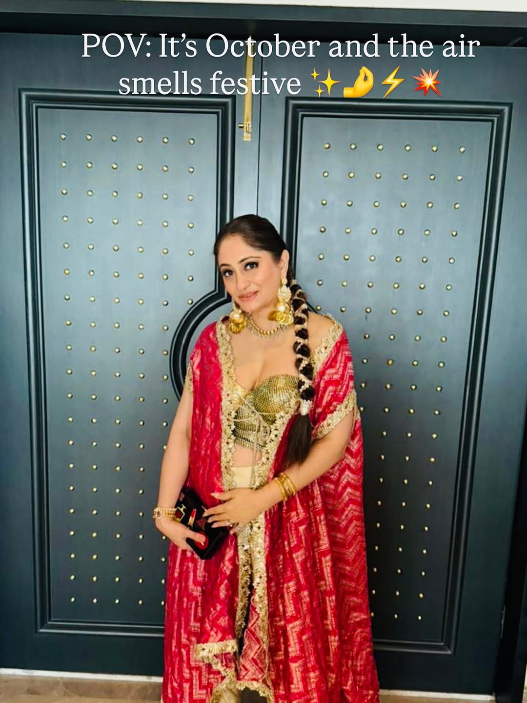 The lights,the colors, the music 🎵- the festive season is here!✨⚡️. Look Deets : Cape @sharminmishal Bustier @ladeeda_couture Dhoti Pants @chiquestudio Earrings @armaans_creationz Neck piece @rajkumarjewellersmumbai Clutch @oceana_clutches HMUA @jayshreehairstyle ( Festive Season , Festive Vibes, Karwachauth , Diwali 🪔, Celebration, Tradition )