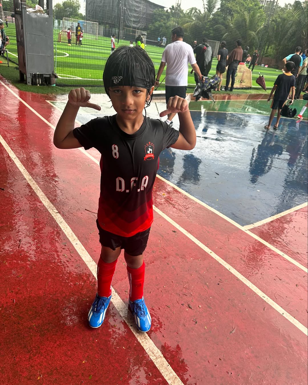 My son reminded me of @iamsrk playing rugby in DDLJ even though he was playing football. He was having a blast playing in the rain and loving being on the field. What a star! Well don’t we all think our children are stars and are the absolute best. That’s where the connection came from. Let the kids have fun and see them bloom. They not only won matches but also created so many memories on the field that day. #football #funintherain #kids @dsouza_footballacademy @tanishq._08 @dsouzaclayton