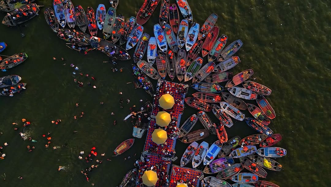 Ganga Yamuna Saraswati [Mahakumbh2025, Prayagraj, Kumbh Mela, Drone Shot, Areal, Sangam, Screen Grab]