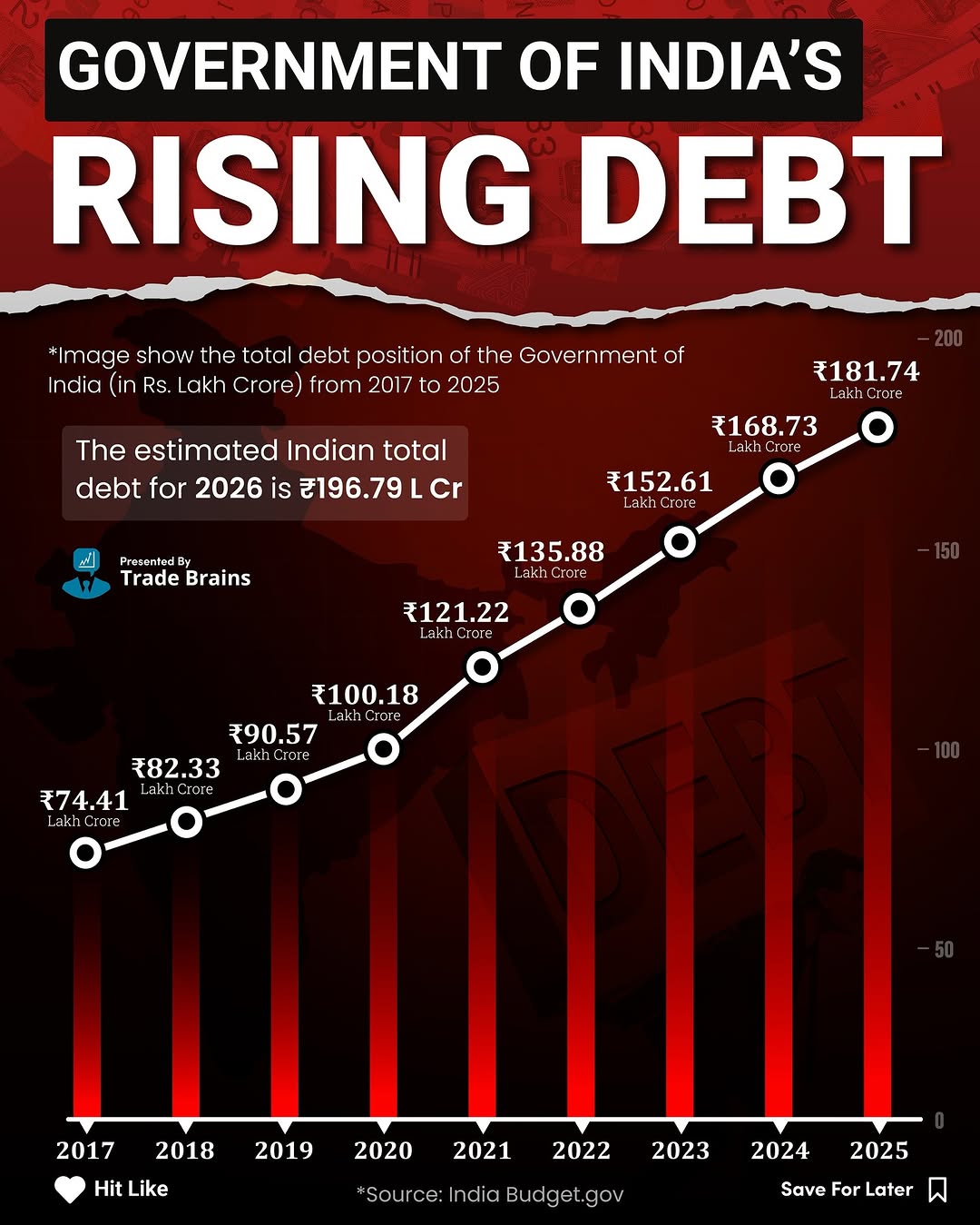 📊 Over the past years, India’s government debt has steadily risen — shaped by expanding developmental needs, infrastructure investments, and evolving fiscal priorities. It highlights how a nation’s growth journey often comes with growing obligations, balancing progress with long-term sustainability. 🇮🇳💡 💠But the big question is — how long can this rising debt remain sustainable for India’s economy? Follow @trade.brains Follow @trade.brains #tradebrains #breakingnews #infographics #governmentofindia #indiangovernment #risingdebt #debt