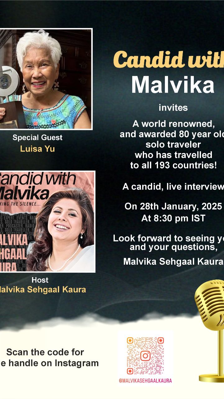 Candid with Malvika invites Luisa Yu A world renowned, and awarded 80 year old solo traveler who has travelled to all 193 countries! A candid , live interview On 28th January, 2025 At 8:30 pm IST Right here.... Look forward to seeing you and your questions, Malvika Sehgaal Kaura Candid with Malvika Talks that empower, enlighten and entertain. Let's interview YOU and share your story with the world. From self-help to work to women empowerment to travel and more, these are conversations you need to share to be a change-maker . Solo travel: so many reasons and so many inhibitors Let's hear from the woman who has visited EVERY country in the world how... 2025 is YOUR year to achieve all your dreams 🙂 Kaftan @design_solutions_delhi Painting @theartloftnewdelhi #solotravel #candidwithmalvika #malvikastraveldiaries #solotravel #malvikasmantras #travelinfluencer