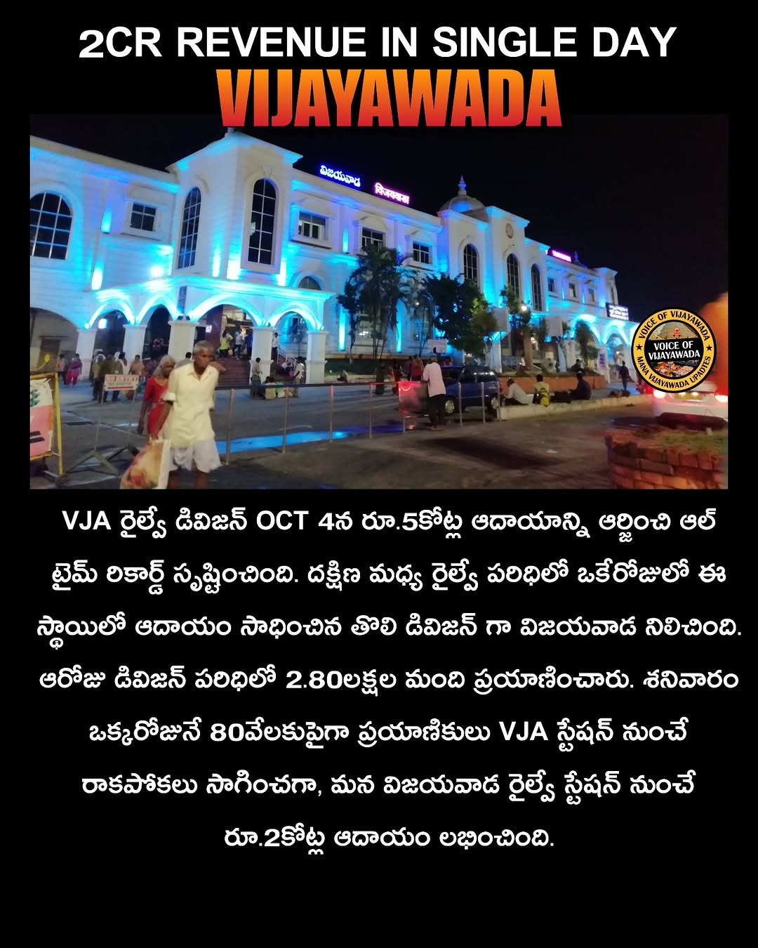 This post was published on 06th October, 2025 by Voice of vijayawada on his Instagram handle "@voice_of_vijayawada_ (Voice of Vijayawada | Kiran Dagani)". Voice of vijayawada has total 172.9K followers on Instagram and has a total of 1.7K post.This post has received 3.1K Likes which are lower than the average likes that Voice of vijayawada gets. Voice of vijayawada receives an average engagement rate of 7.34% per post on Instagram. This post has received 23 comments which are lower than the average comments that Voice of vijayawada gets. Overall the engagement rate for this post was lower than the average for the profile. #vijayawadadaires #instagram #vijayawadaupadates #vijayawadarailwaystation #instagramreels #dasara2025 #railway #kanakadurga #kanakadurgammanimajjanam #dasarafestival has been used frequently in this Post.