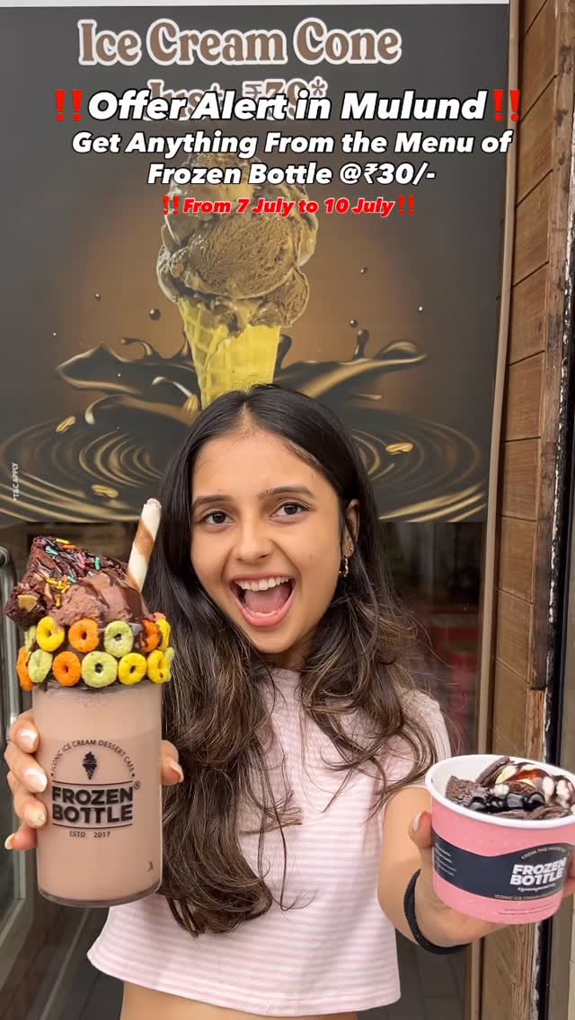 Get anything from the menu at just ₹30 - yes, you heard that right! Frozen Bottle- India’s fastest growing ice cream brand is bringing their biggest monsoon offer of the year. @frozen_bottle . . Buy any product and get second product at just 30rs! . Whether it’s Thick shake, sundae, waffles or a Gudbud jar - everything at just Rs30/-. It’s the perfect time to treat yourself and your loved ones. . . This offer is available only from July 7th to 10th, across all Frozen Bottle outlets in India. . . So what are you waiting for? Share this reel with your friends, grab your gang, and head to your nearest Frozen Bottle store before this offer melts away! . . #frozenbottle #offer #mulund #mulundwest #milshake #dessert #thickshake #sundae #icecream #boba #viralreels #mumbaifoodie #trendingreels #foodporn #food #drinks