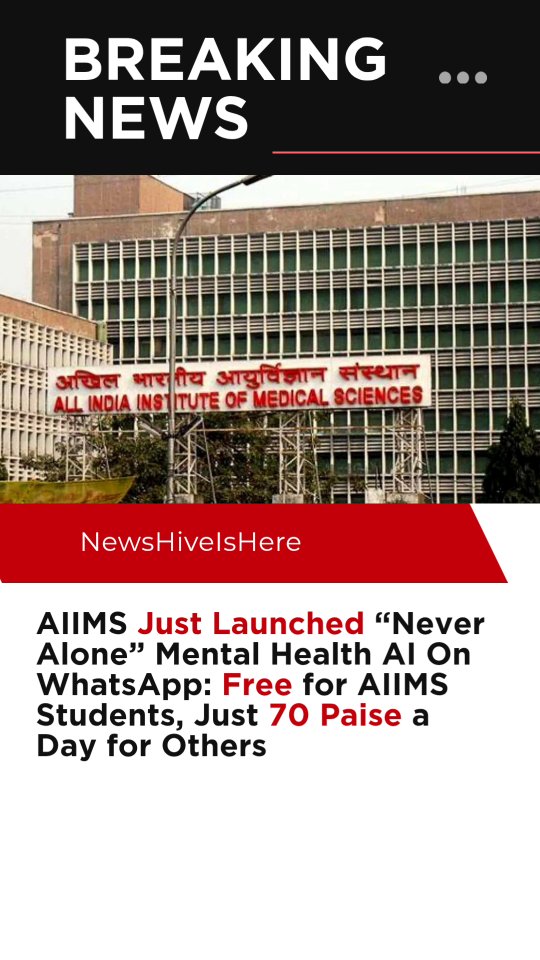 AIIMS has just launched “Never Alone”, an AI-powered mental health program now available on WhatsApp. ✔ Free for AIIMS students (Delhi, Bhubaneswar, Shahdara) ✔ Low-cost for others – as little as 70 paise per student per day ✔ Covers screening, counseling, interventions, and follow-ups This initiative is a major step in breaking the stigma around mental health and ensuring accessible support for students across India. #AIIMS #NeverAlone #MentalHealthMatters #WhatsAppAI #StudentSupport #IndiaNews #HealthTech #Counseling #Wellness