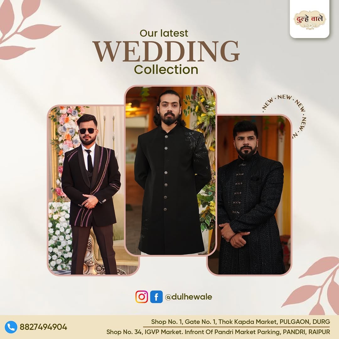 Your perfect wedding look begins at Dulhe Wale! 💍✨ Discover an exclusive collection of Sherwanis, Suits, and Accessories that redefine elegance for every groom. 📍 Locations: Pulgaon Chowk, Durg - Gate No. 1, Near Lovely Look Raipur: Main Road, Kapda Market, Pandri Parking ke samne, in front of Gate No. 1 📞 Contact Us: 8827494904 #DulheWale #GroomStyle #WeddingCollection #SherwaniDesigns #TraditionalElegance