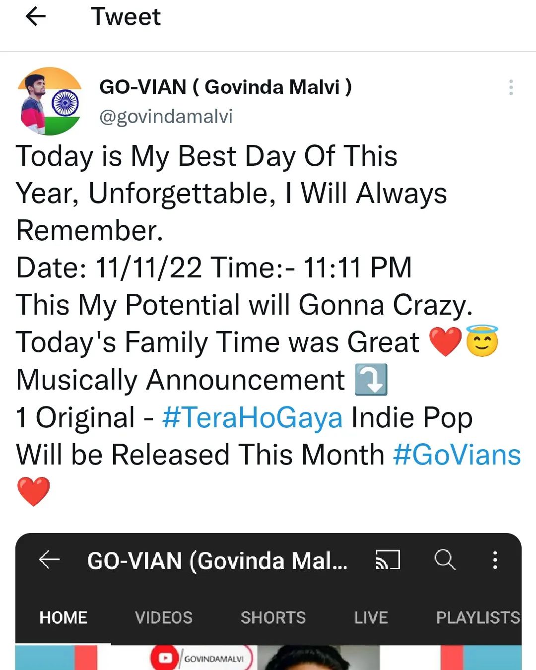 This post was published on 01st June, 2022 by Govinda on his Instagram handle "@govian.music (GOVIAN ❤️🎵)". Govinda has total 924 followers on Instagram and has a total of 175 post.This post has received 51 Likes which are than the average likes that Govinda gets. Govinda receives an average engagement rate of 5.82% per post on Instagram. This post has received 0 comments which are lower than the average comments that Govinda gets. Overall the engagement rate for this post was lower than the average for the profile. #RIPKK #RIPLegend has been used frequently in this Post.