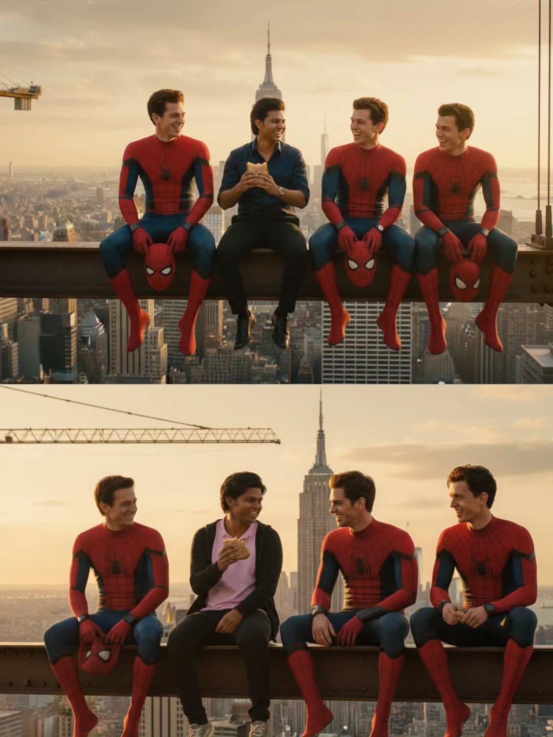 🕸️ When Universes Unite at Dusk 🕷️ Just hanging out with all three Spider-Men on a steel beam above NYC – no masks, just genuine vibes, sunset, and a snack Sometimes the multiverse is about sharing moments, not saving worlds #SpiderVerse goals achieved! Follow me @TechyImran #SpiderMan #SpiderVerse #PeterParker #Multiverse #MarvelMoments #CinematicPhotography #NYCSunset #GoldenHourMagic #SuperheroVibes #ViralEdit #PhotoshopArt #FanArtPhotography #AIArtCommunity #CityscapeGoals #CreativeVisuals #ArtOfImagination #MovieSceneEdit #GoogleNanoBanana #SpidermanEdit #AboveTheCity #CinematicShot
