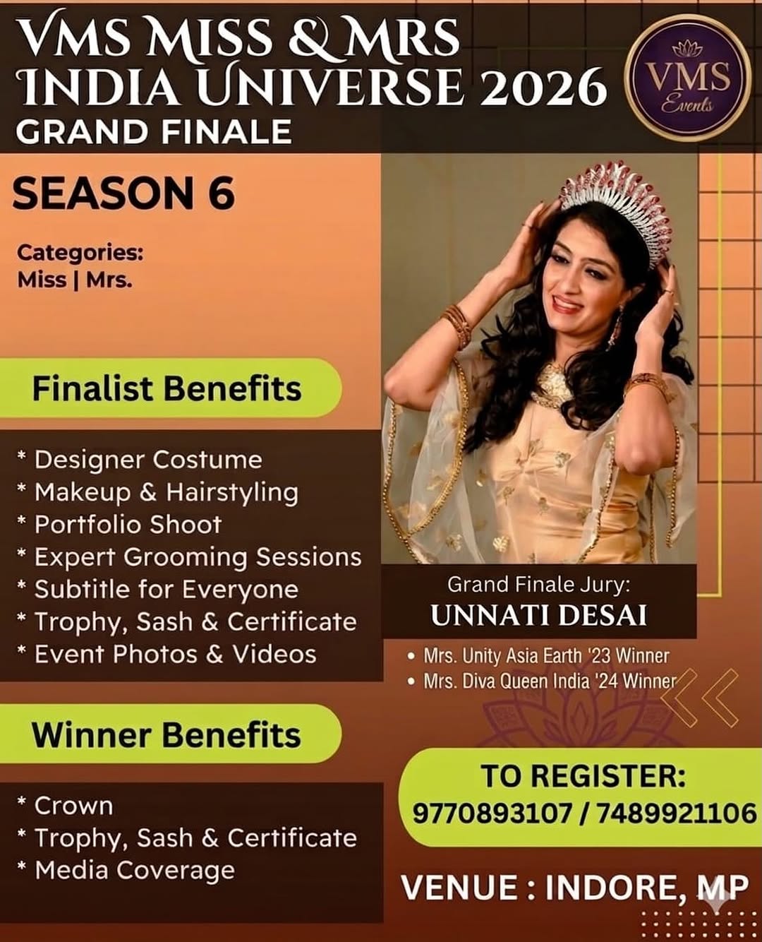 • Mrs. Unity World Asia 24. • Mrs. Gujarat. • Mrs. Baroda. • Lakme Mrs. Best Catwalk