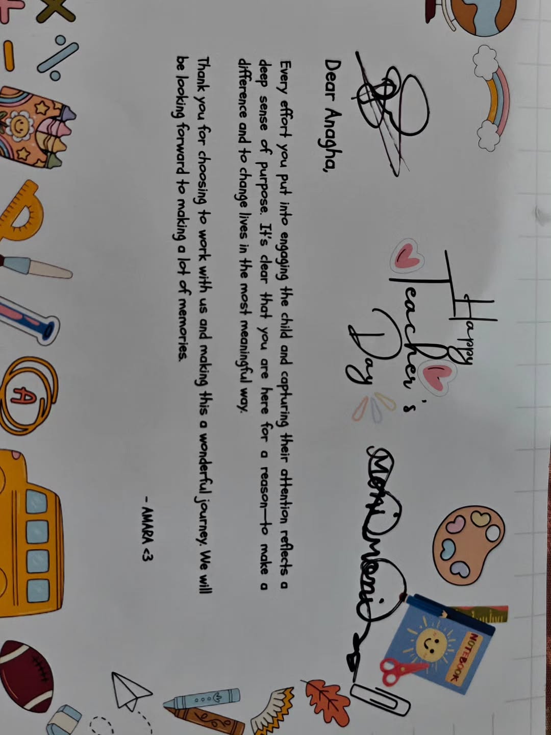 The Manobhaava of seva ! In a world where everyone is obsessed about self growth and the self, the act of becoming a bit selfless is where the flex is..and if we as parents, can imbibe that in our children , we have done our bit towards creating a society where empathy and love still exists. My daughter teaches under privileged kids at an orphanage called Amara over the weekends. And today they gave her this small gesture of love on account of teacher's day ..my heart only swells when pride and have tears of joy 🥲🥰
